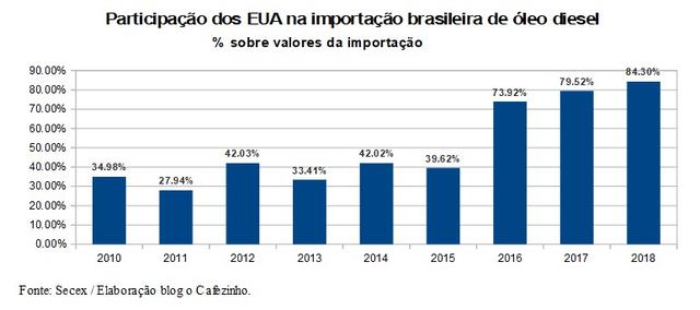Quase todo o diesel, ou 84,3%, veio dos Estados Unidos. As exportações americanas de diesel para o Brasil totalizaram US$ 5,3 bilhões em 2018, o que significa um aumento de 195% desde 2010.